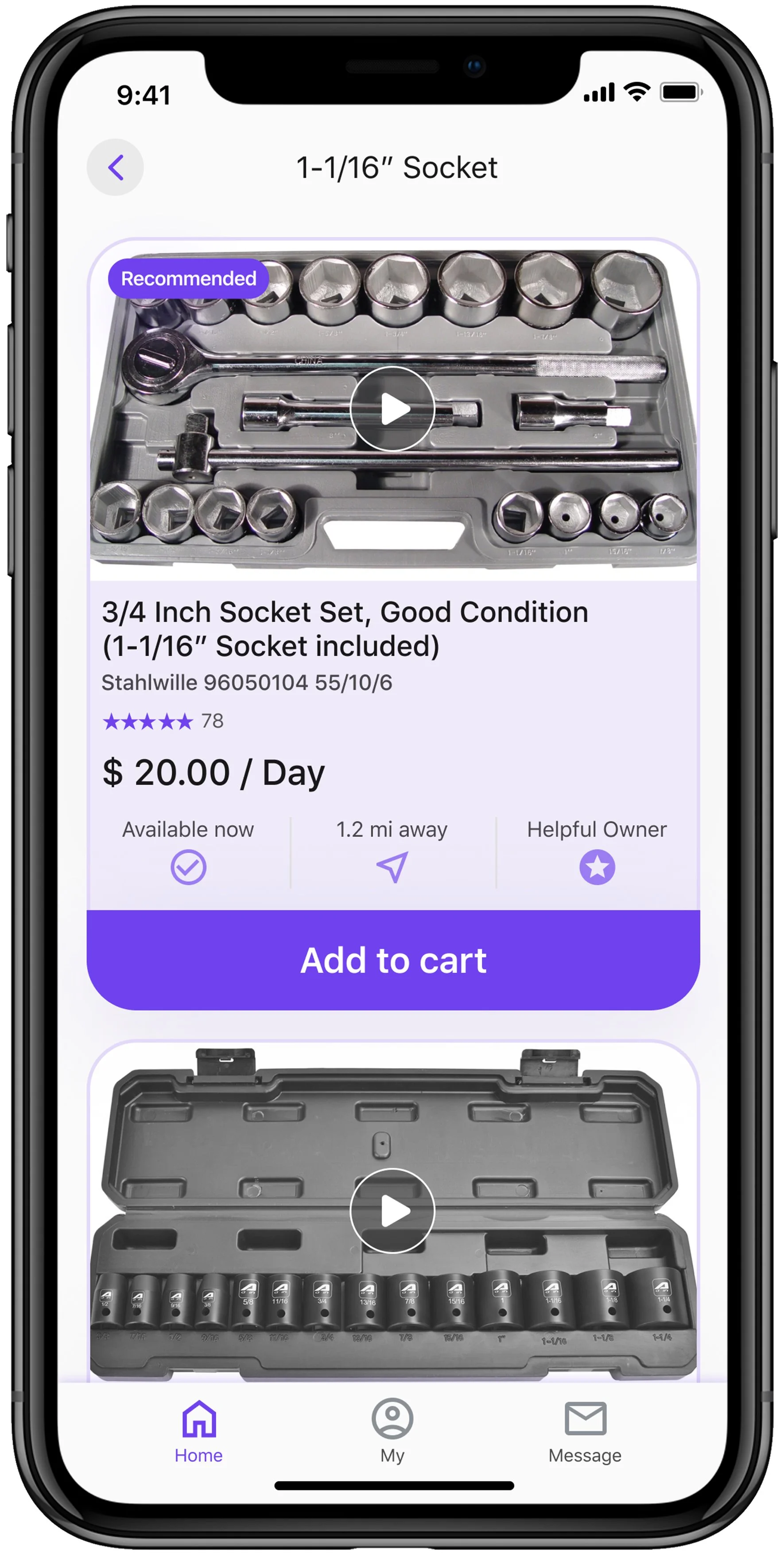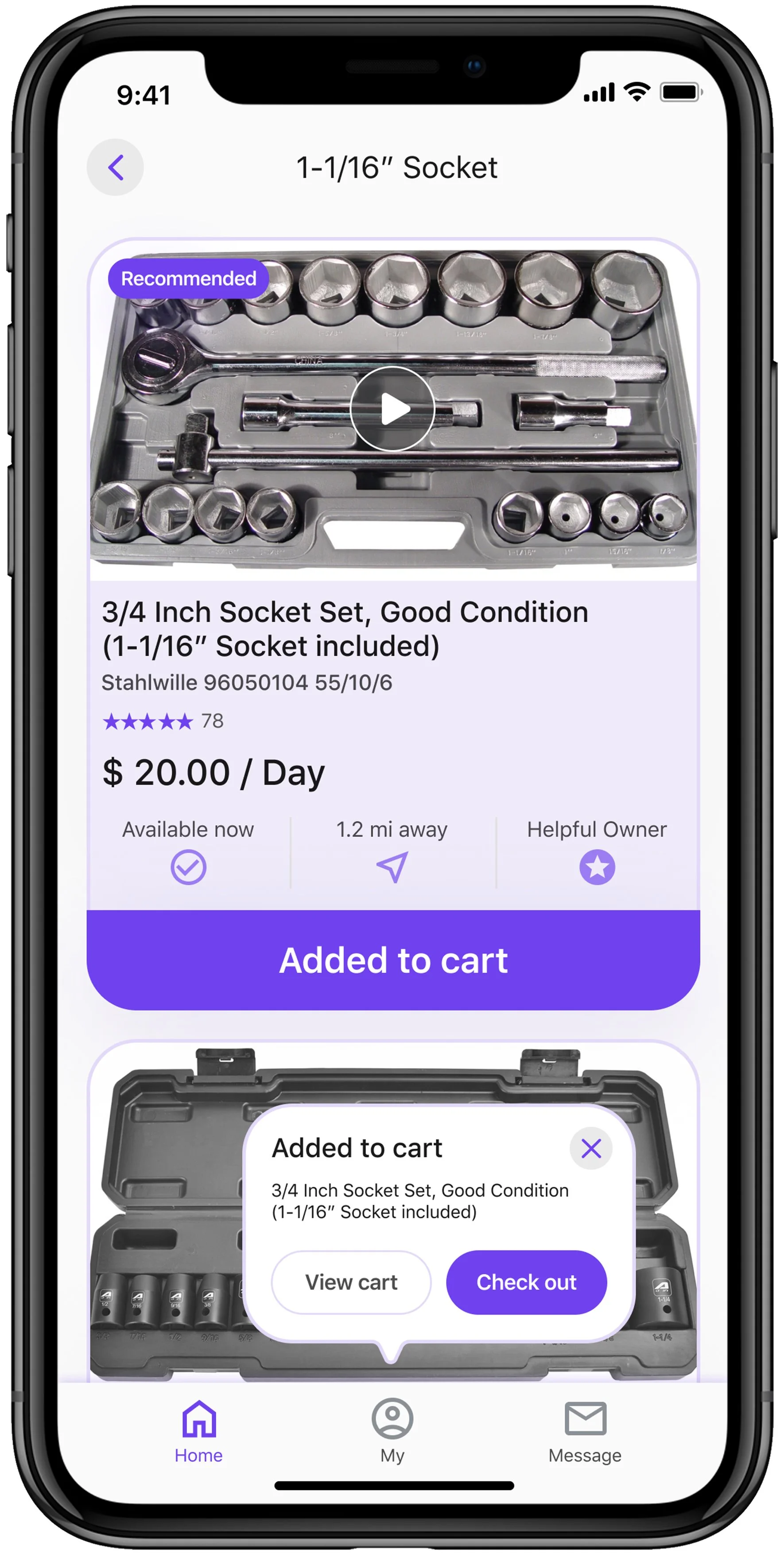 The card gives Parth options to chat with the owner before and after adding the tool to the cart. And users are able to add more tools to the cart and pay for them together.